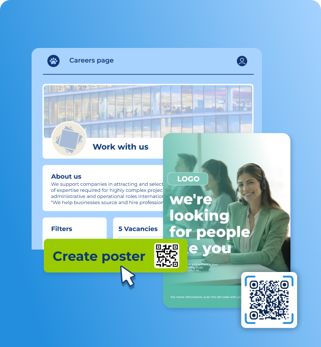 Bridge the physical and digital worlds with custom QR codes and posters. Place them in branches, stores, universities, or events, and candidates can apply instantly by scanning them with their phone.